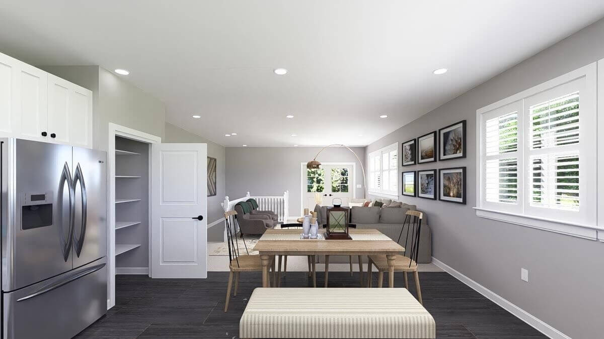The kitchen and dining areas are placed together to make cooking and serving meals efficient.