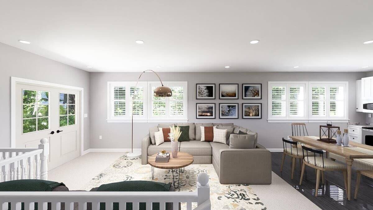 The great room has access to the outdoor balcony and the kitchen/dining areas.