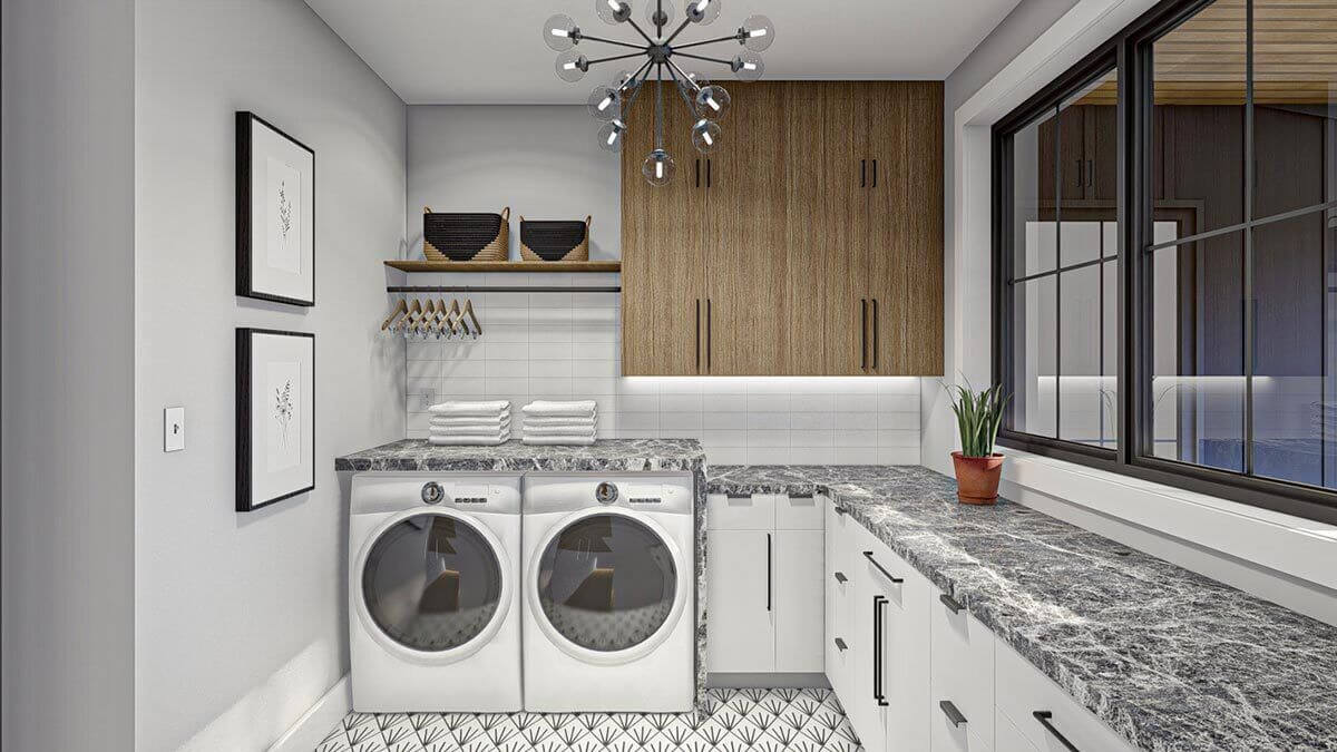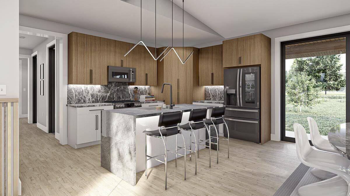 This contemporary barndominium-style home design offers 3 bedrooms, 3 bathrooms, and a total of 1,706 square feet of heated living space. Its exterior features a captivating blend of metal, wood, and stone, creating an appealing facade.