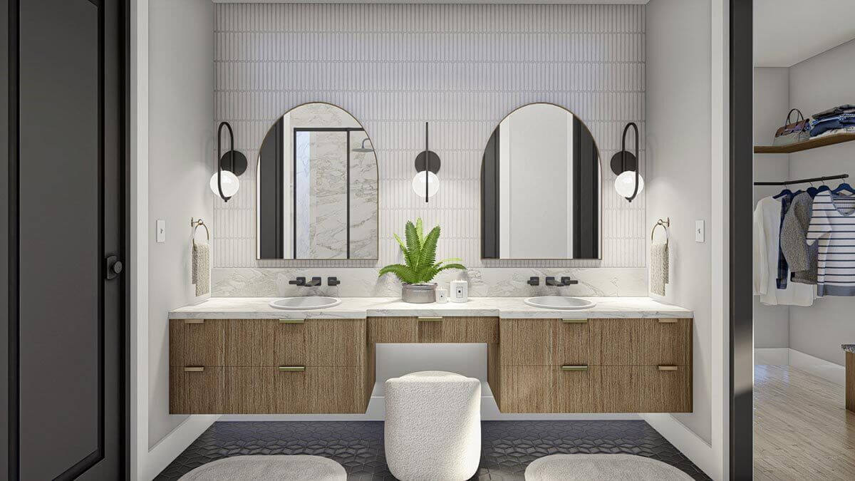 Located on the right side of the house, the master bedroom comes complete with a sizeable en-suite bathroom featuring dual vanities, separate toilet and shower compartments, and an extensive walk-in closet that includes built-in shoe storage.