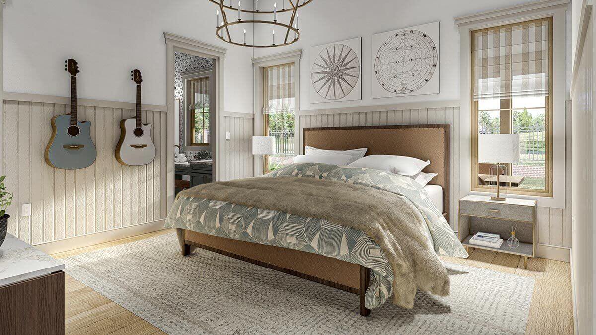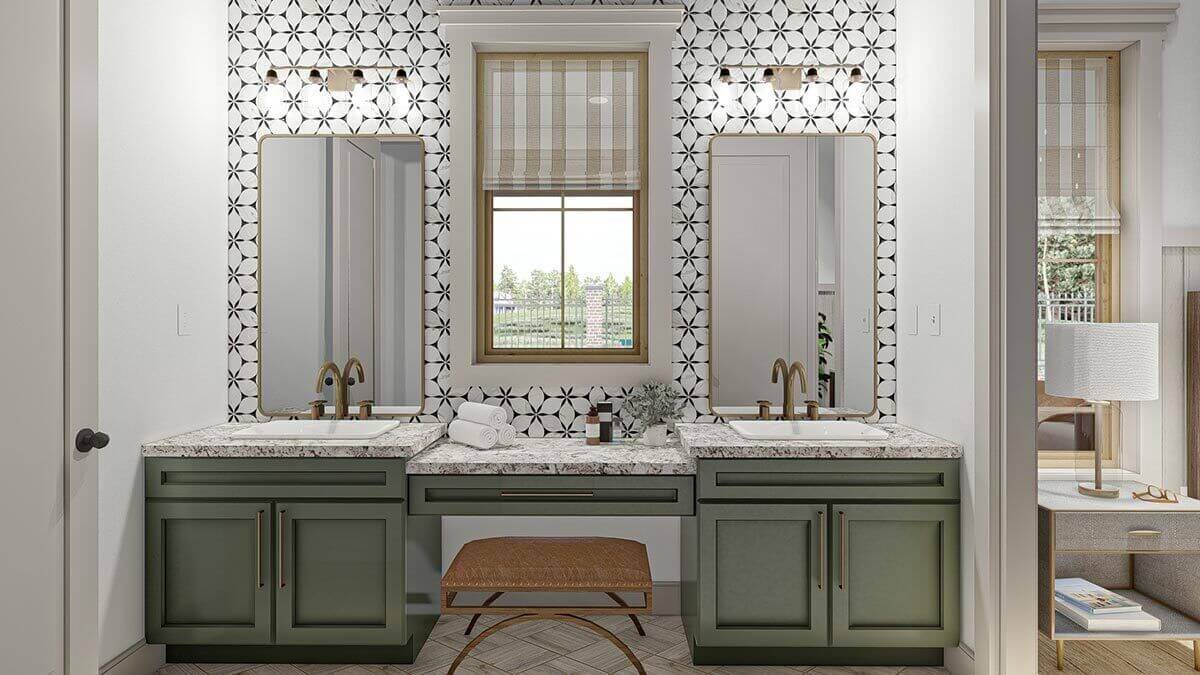 On the right side of the house, you’ll find the master bedroom. The master bathroom features his and her vanities, a linen closet, and a separate enclosed toilet area.