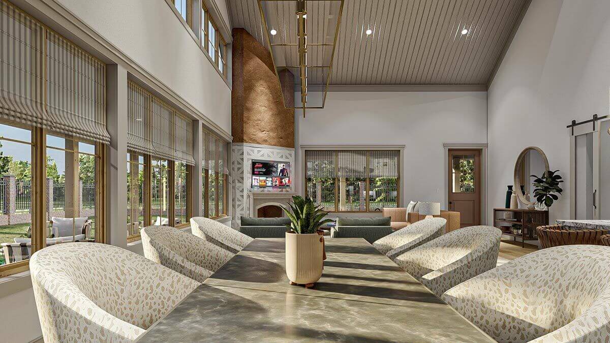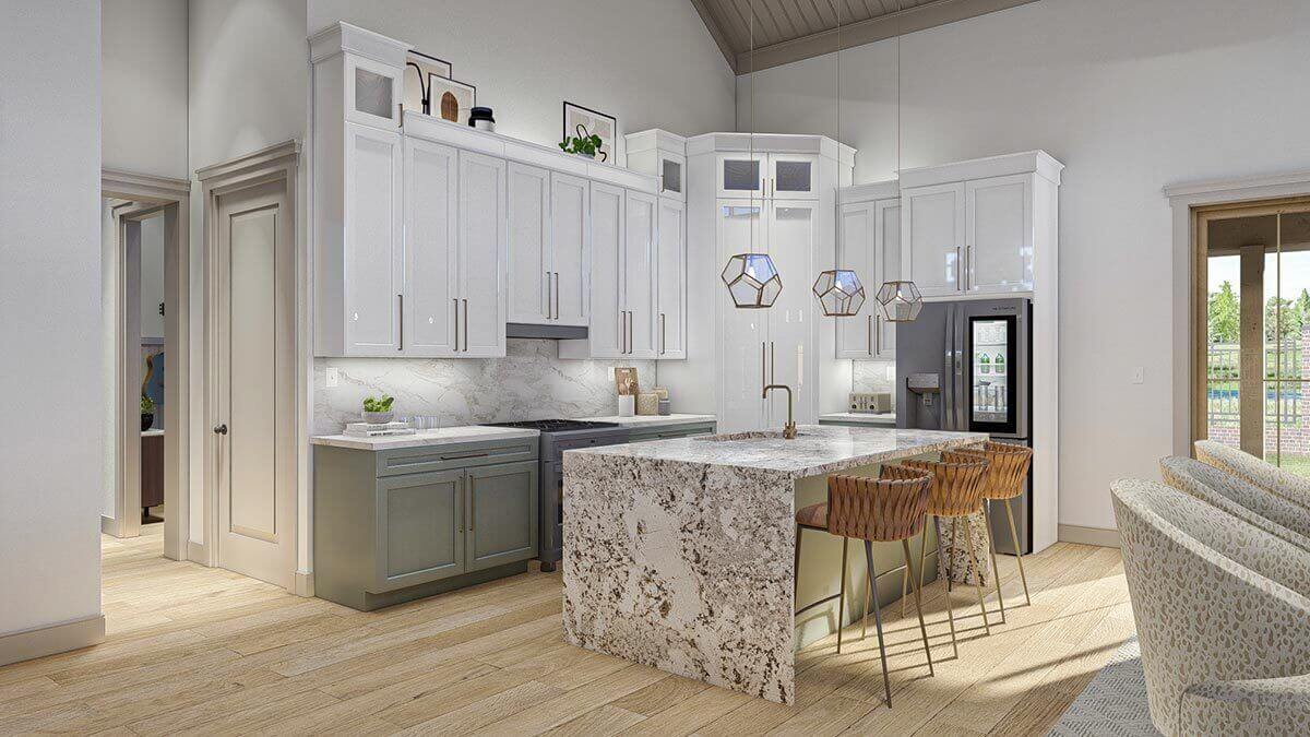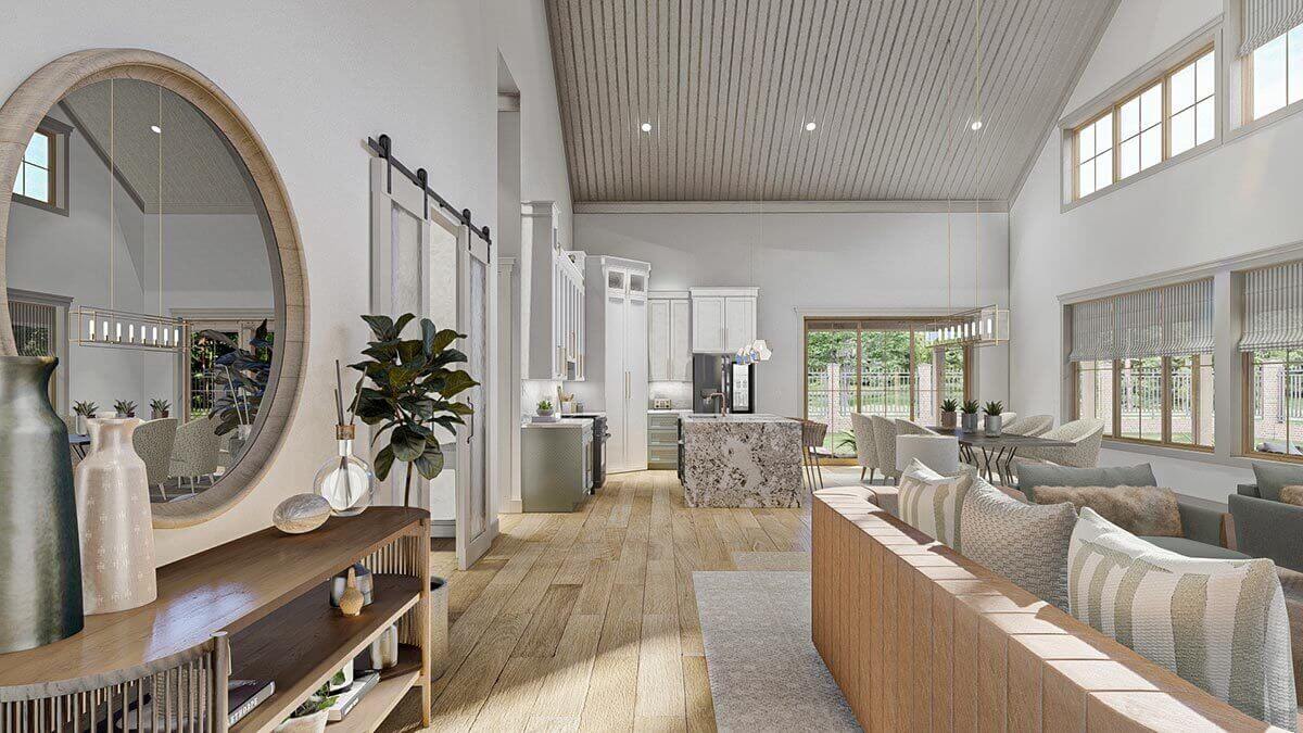 This single-story Barndominium-style house plan features a sleek exterior design, making it highly efficient to construct. The house boasts a spacious 9-foot deep wrap-around porch, offering ample outdoor space for relaxation and enjoyment.