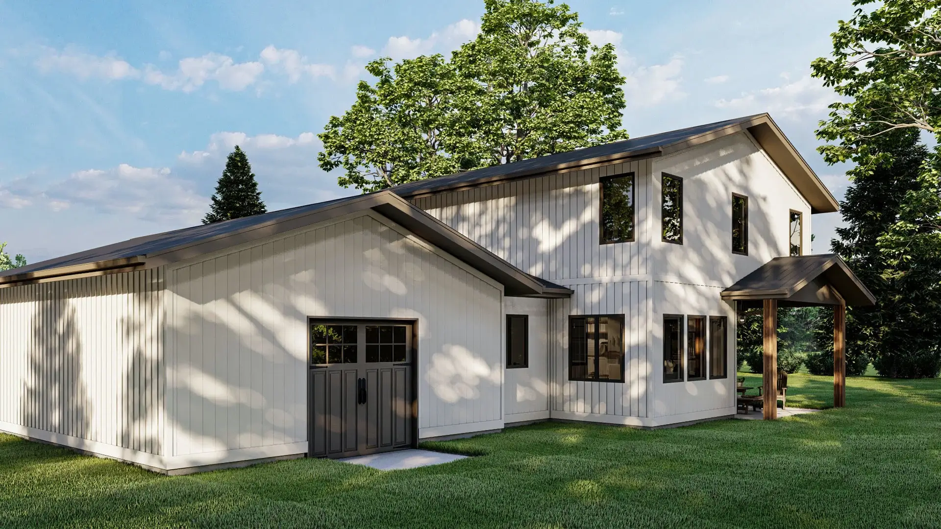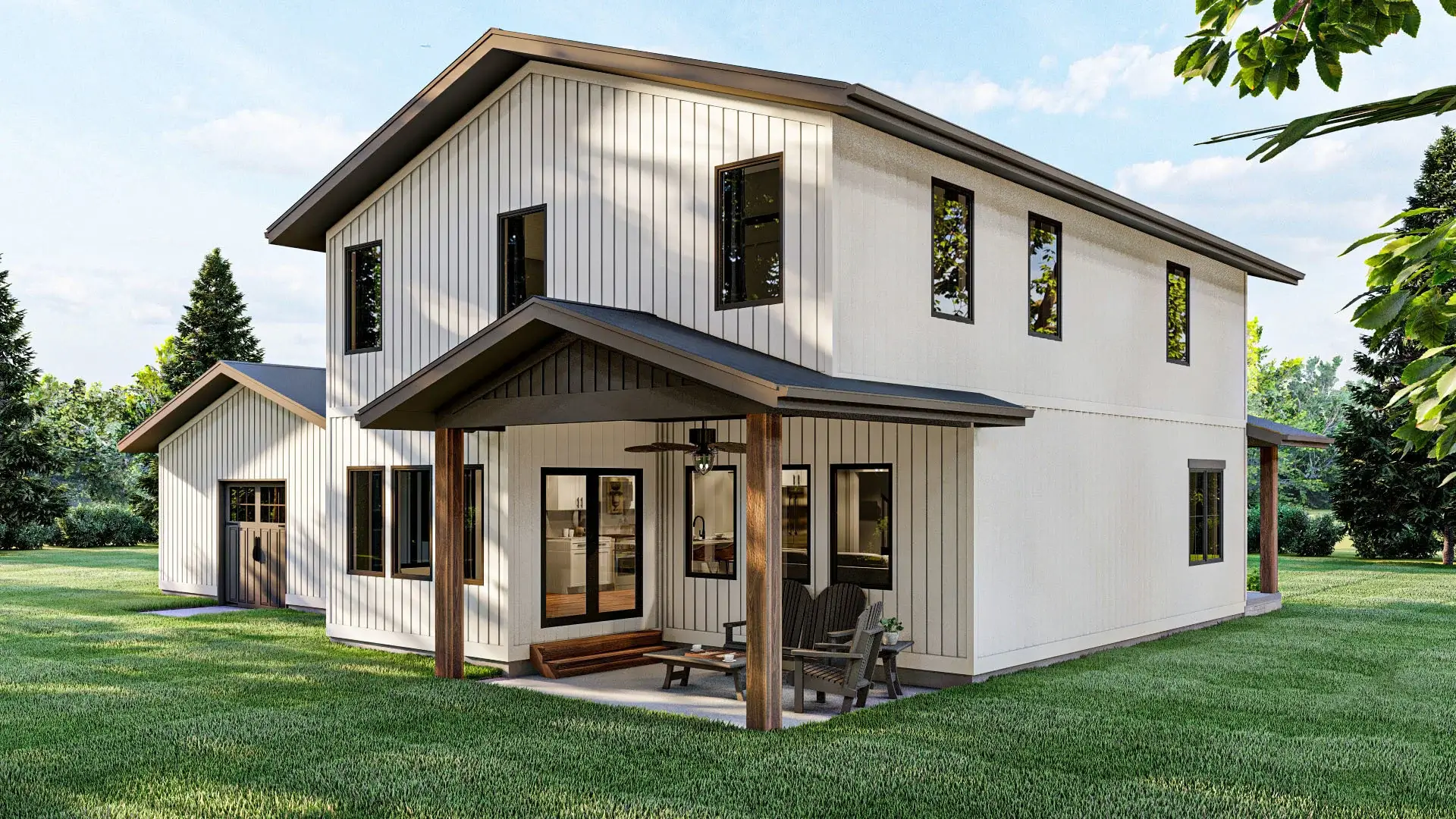 The rear view of this barndominium-style house includes entry doors to the garage.
