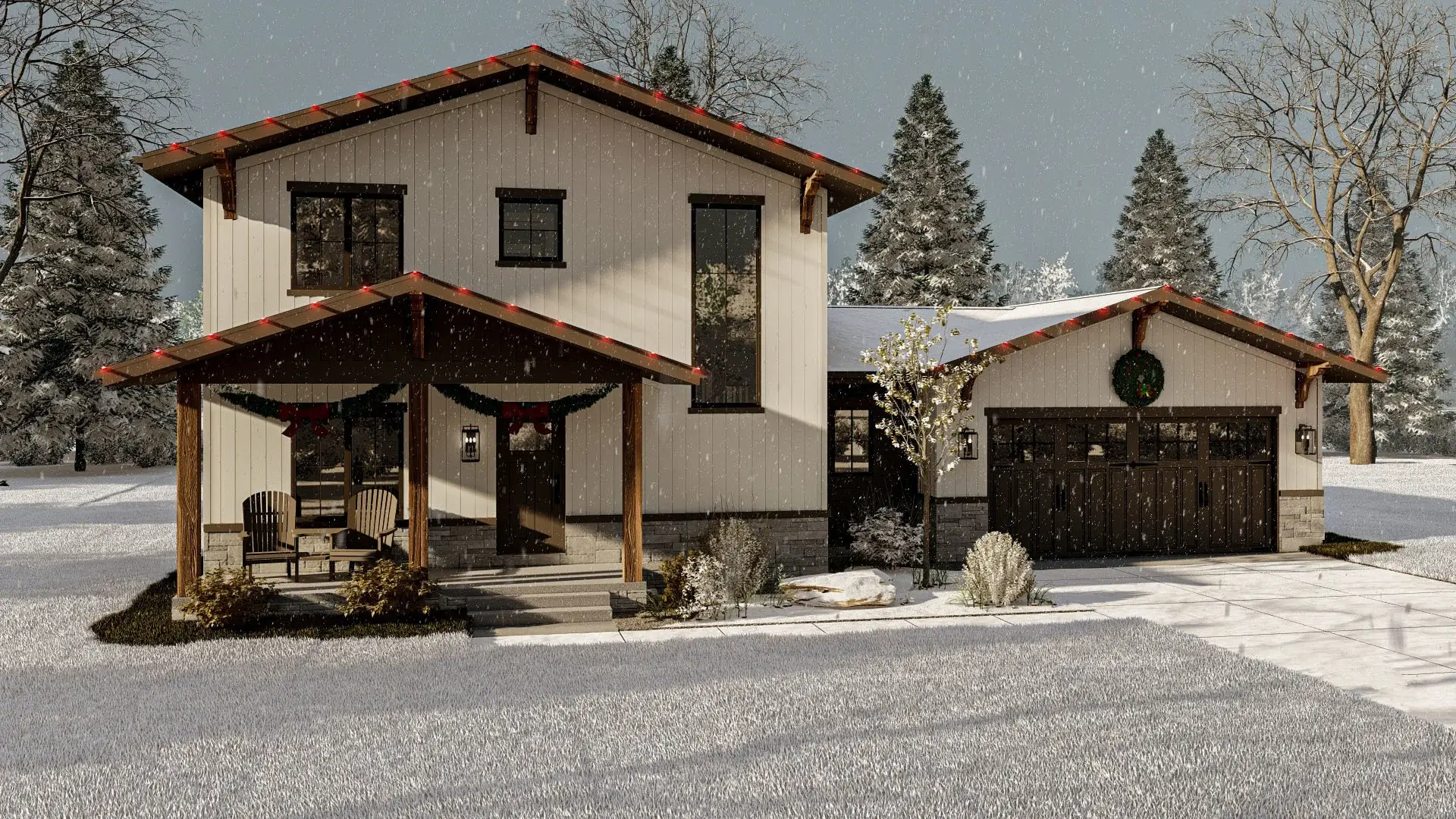 The house’s exterior keeps its composure even as snow falls.