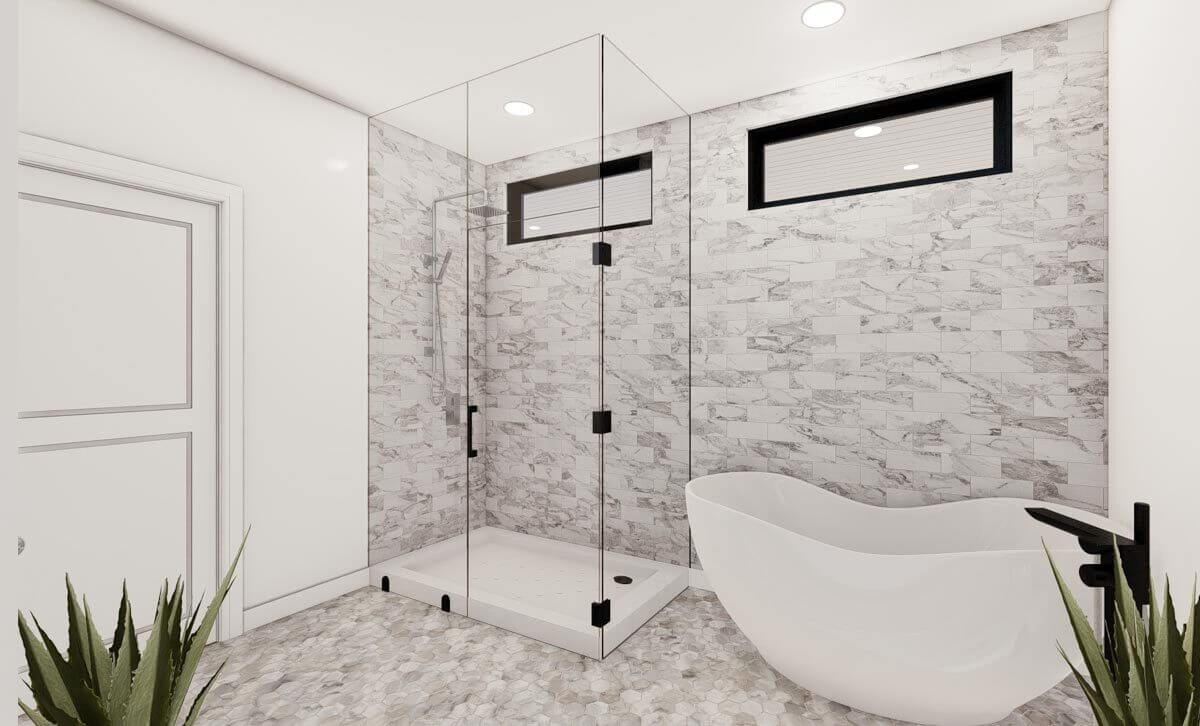 A fully-enclosed shower and a uniquely-shaped bathtub are your bathing options inside the master bathroom.