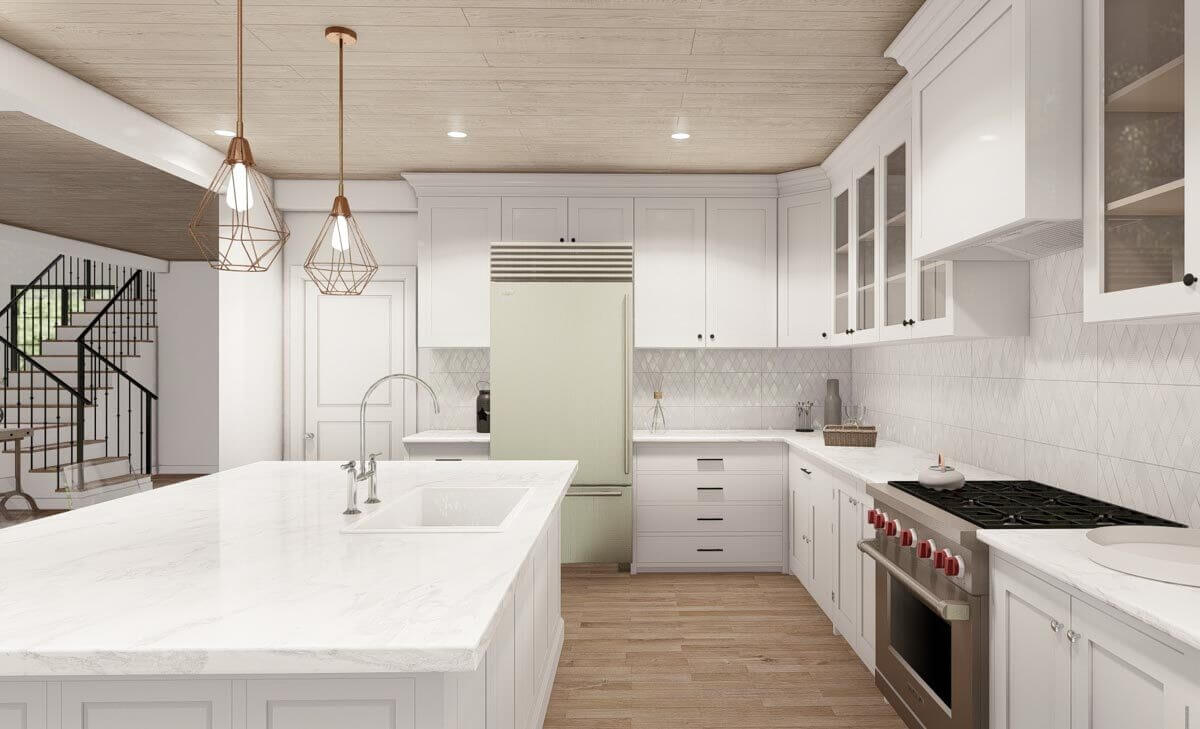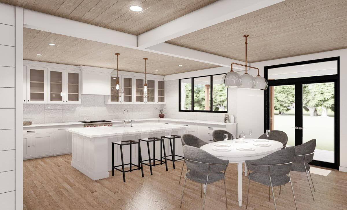 The kitchen showcases U-shaped cabinetry that wraps around the island, and the adjacent dining area offers access to the picturesque rear porch.