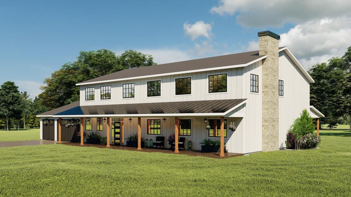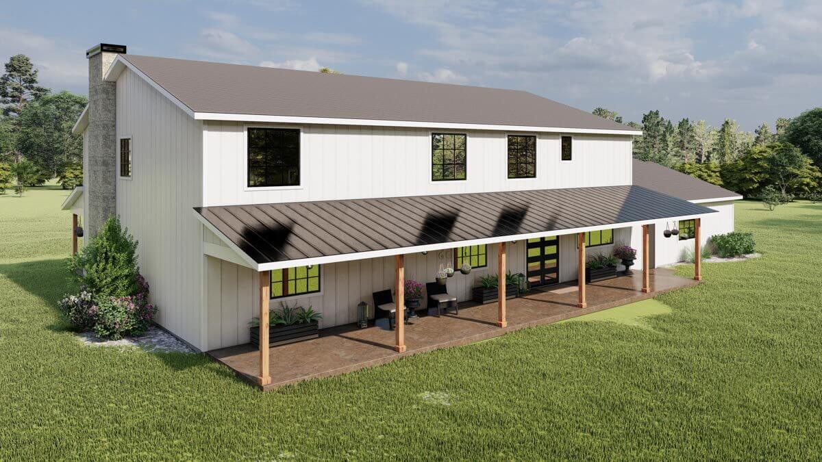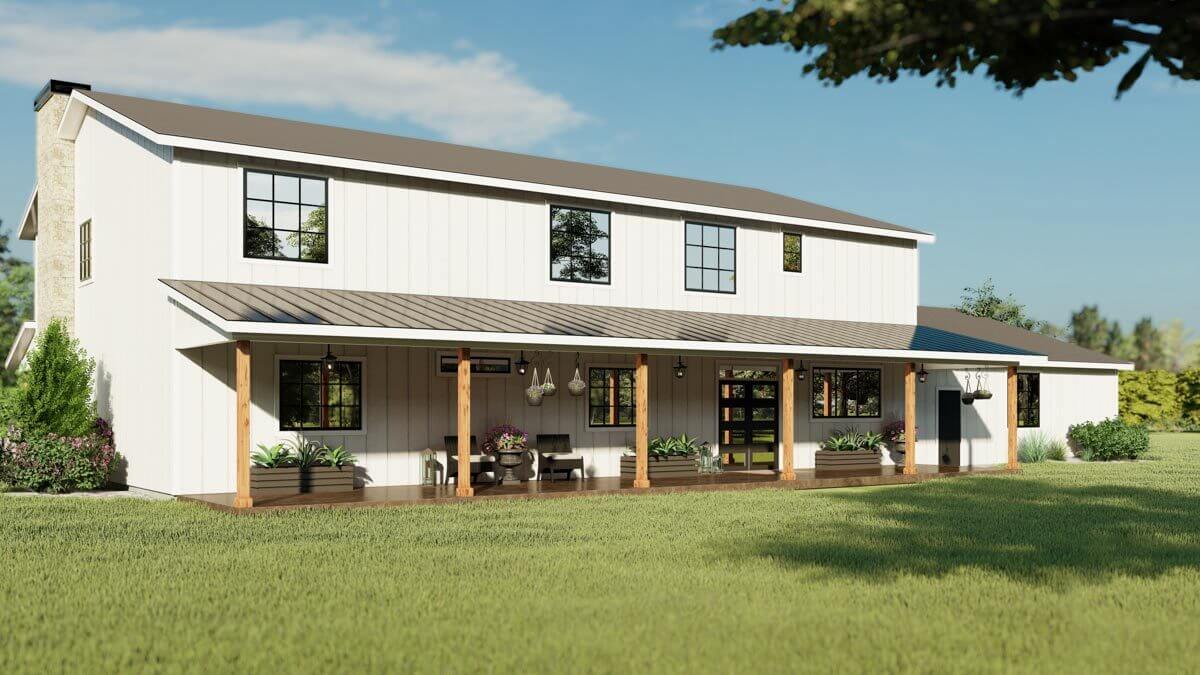 This exclusive Barndominium-style design features front and rear porches that extend the entire length of the house, utilizing conventional 2×6 framing instead of steel.