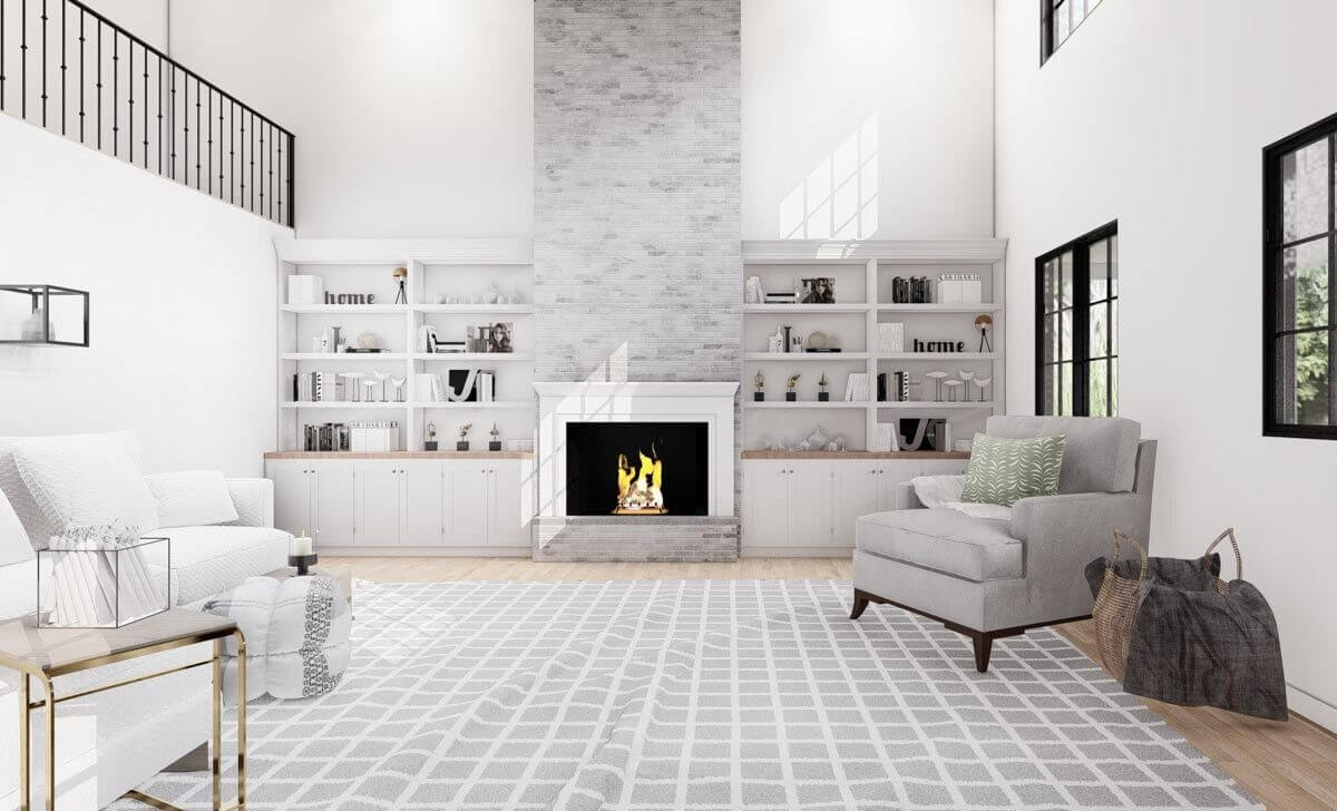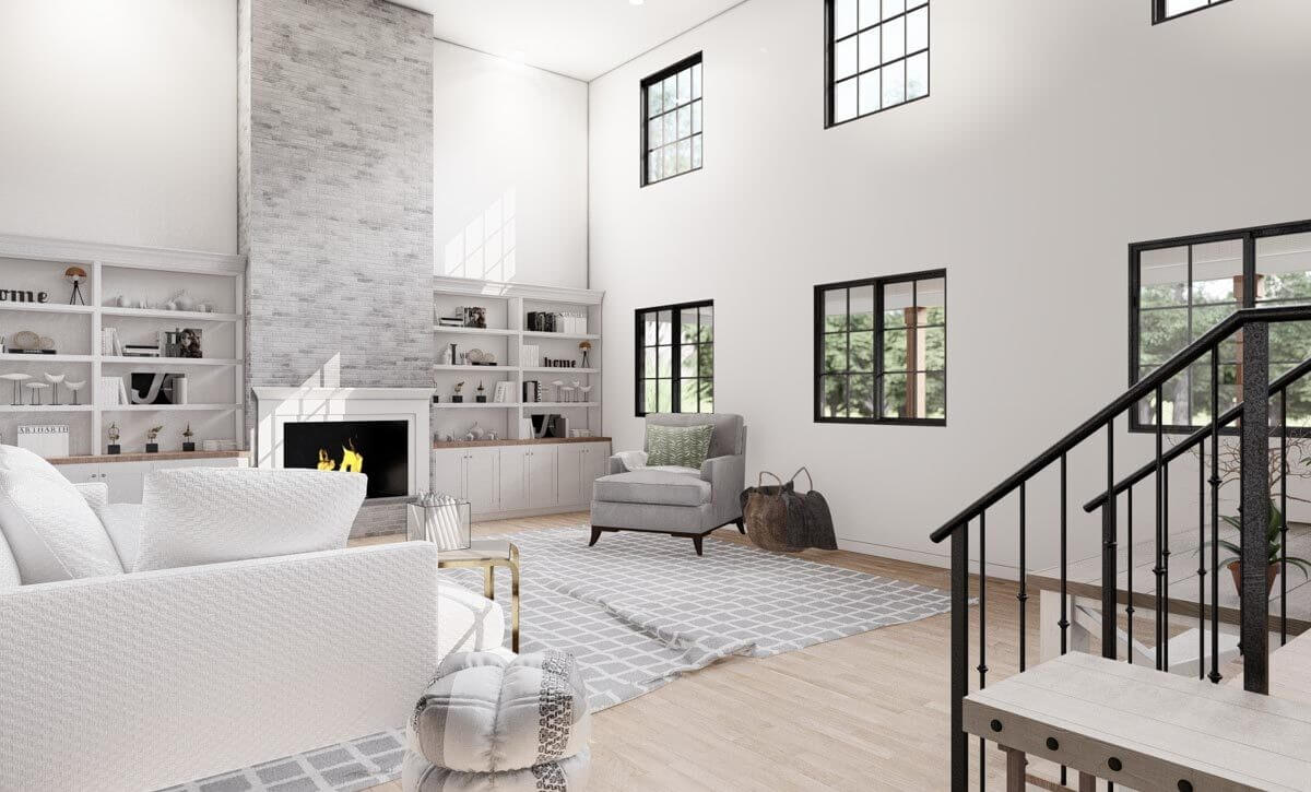 The great room features a modern fireplace with bookshelves at its sides.