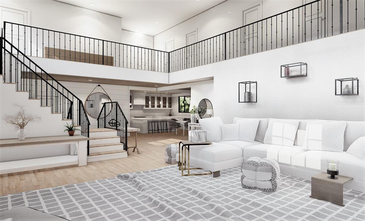 The great room is bordered by the staircase leading to the second floor.