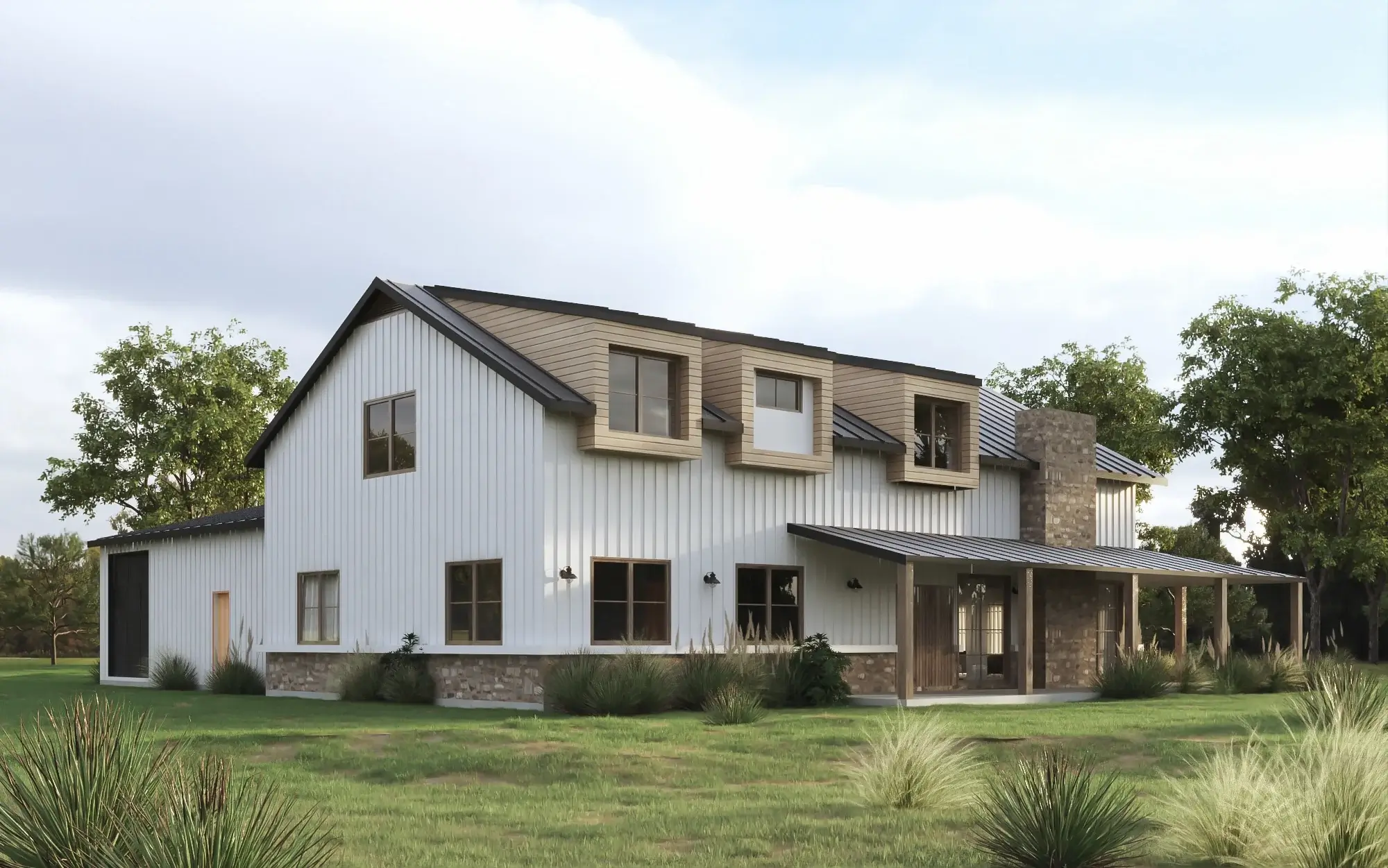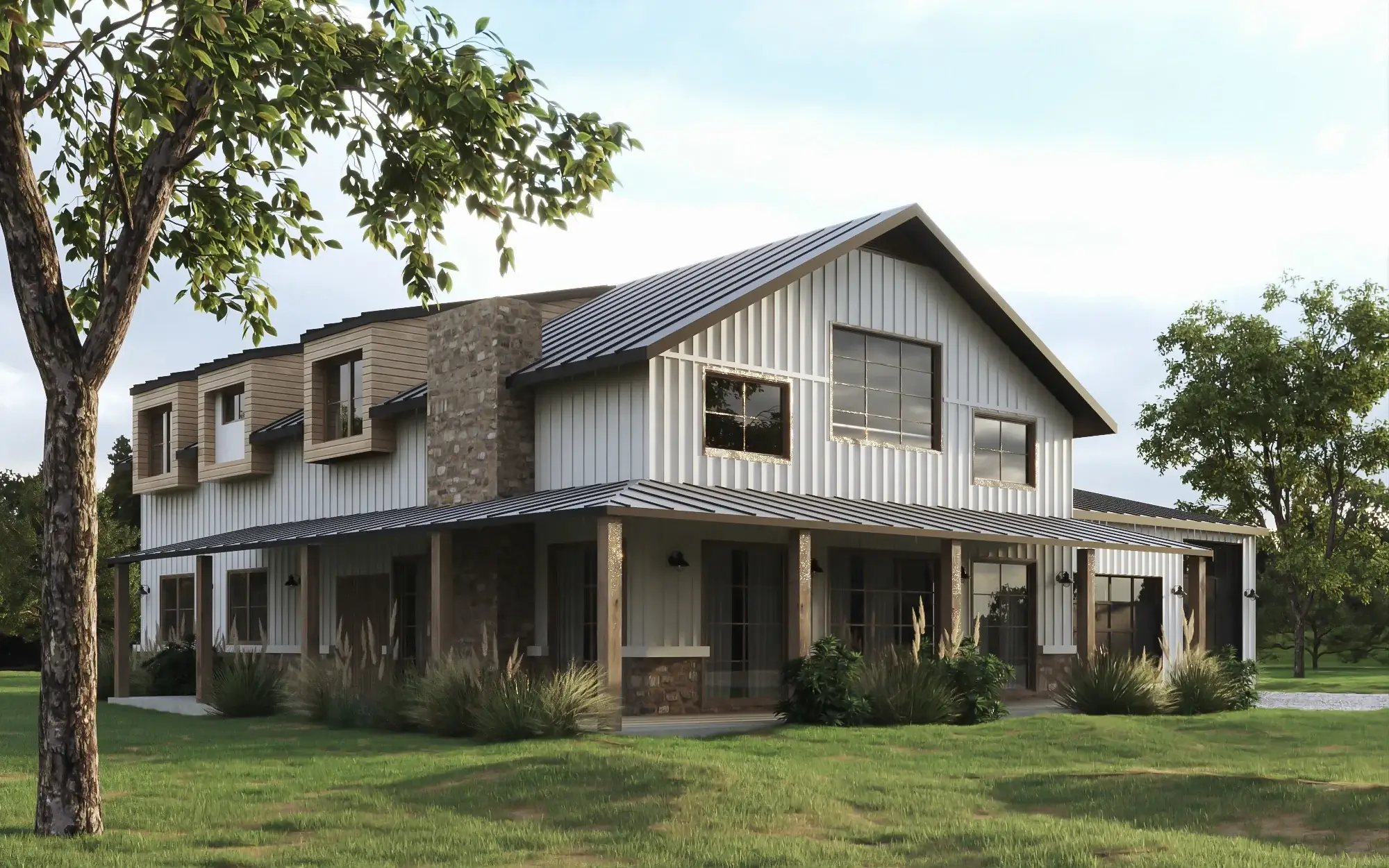 Introducing a contemporary barndominium, boasting an expansive garage equipped with all the essential amenities found in a traditional home.
