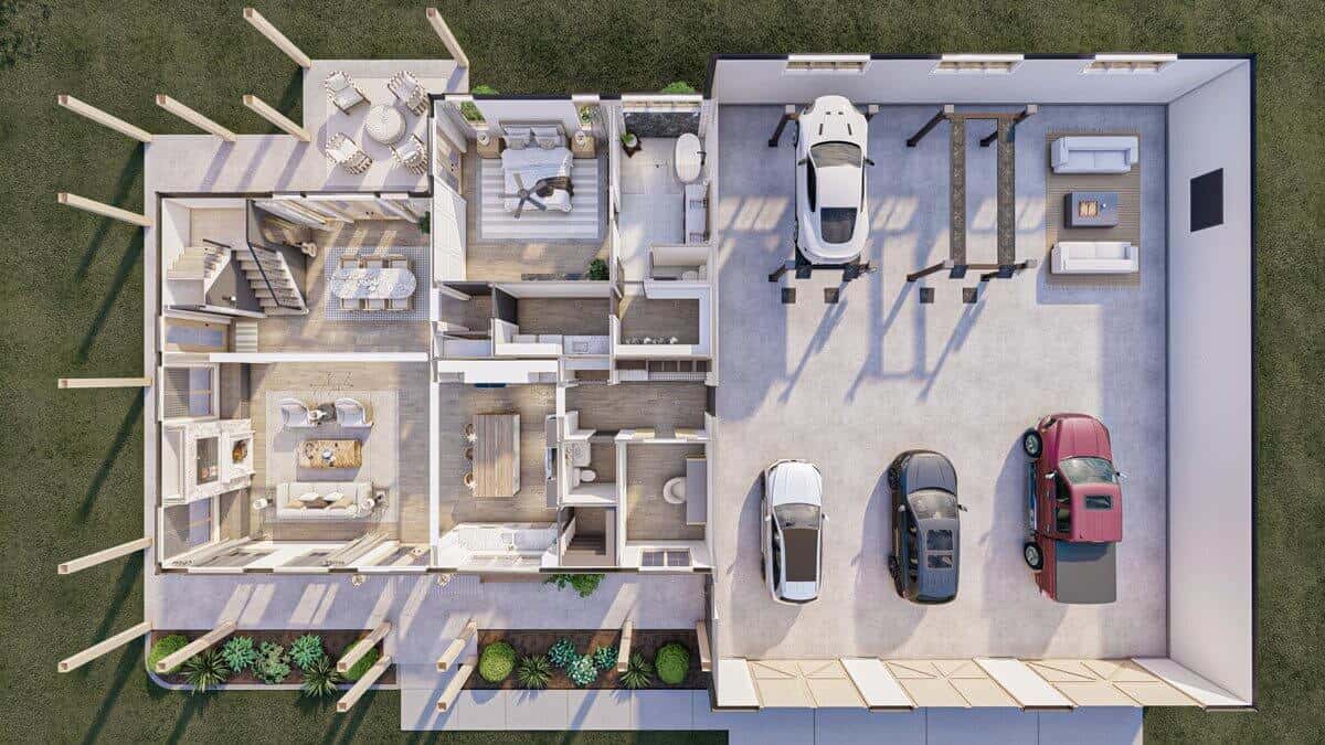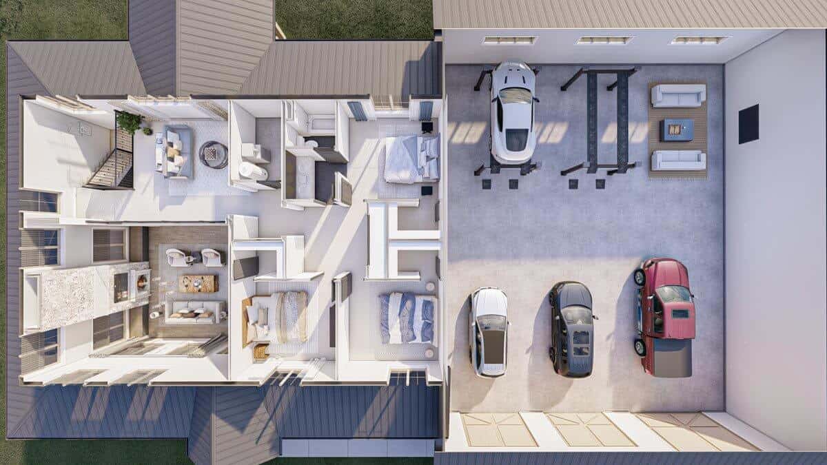 A tridimensional plan highlights the sheer size of the garage and garage shop.