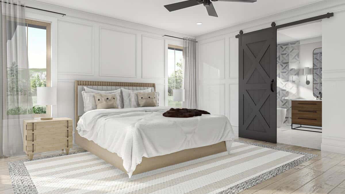 Large and luminous, the master bedroom features a sliding door to the bathroom and decorative walls.