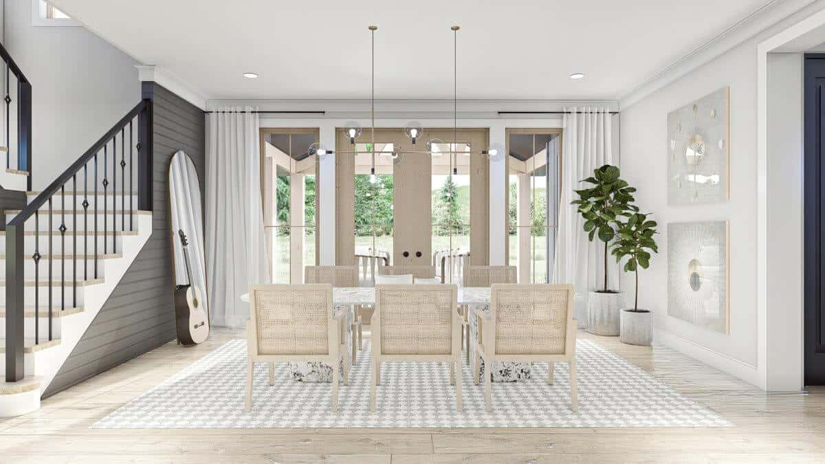 Towards the rear of the house, you’ll discover a large formal dining room, which opens up to the rear portion of the wrap-around covered porch through its own set of French doors.