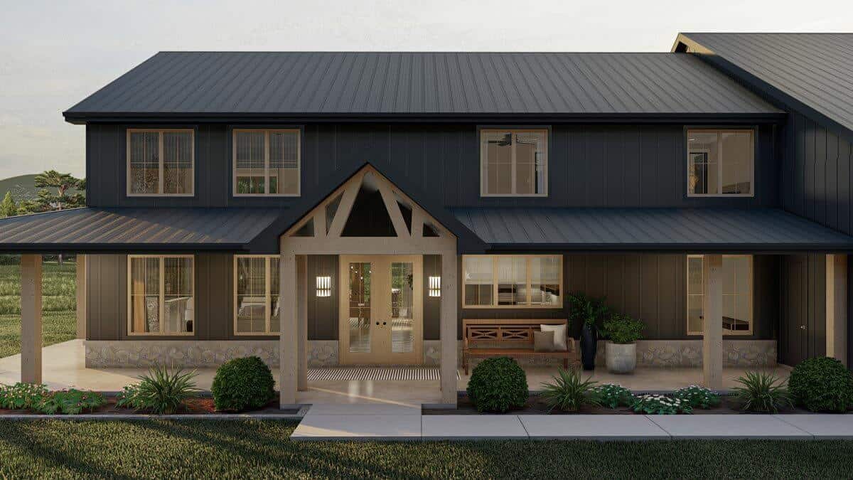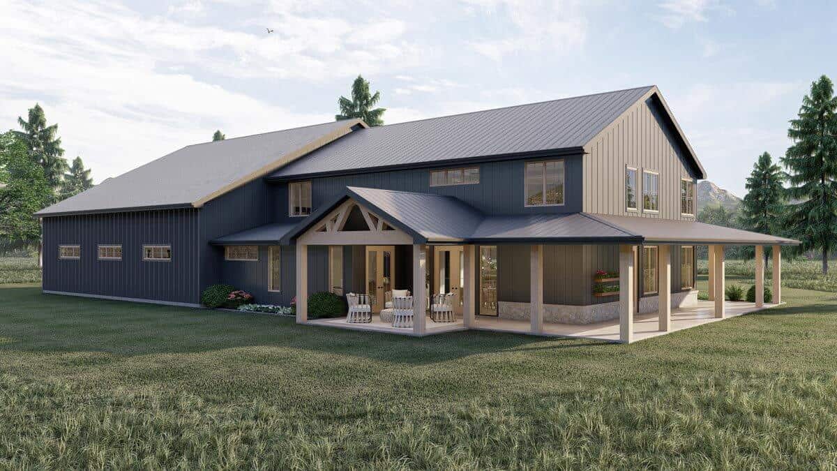 The barndominium-style exterior of this house features board and batten siding, wood accents, and wood garage doors, with a charming wrap-around porch that warmly welcomes guests.