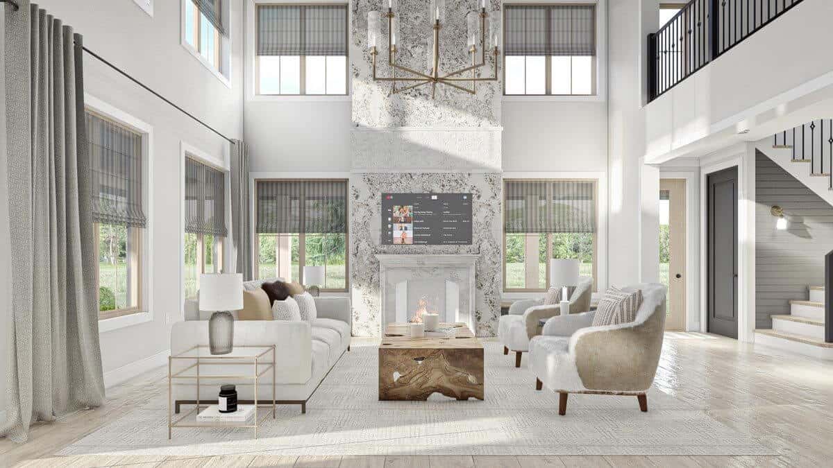 The two-story ceiling adds vertical dimension in the ample great room, while the fireplace becomes the focal point.