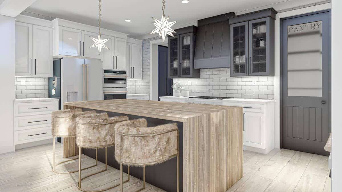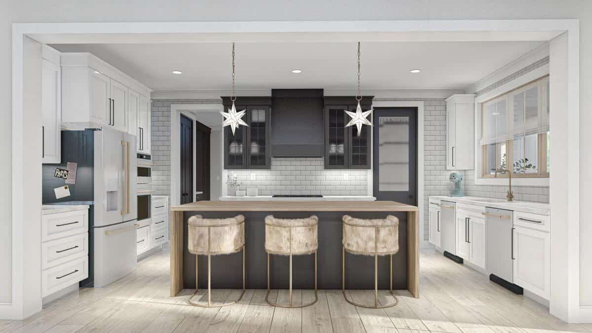 The kitchen is ample and functional, but design elements are still found in the bar chairs and suspended light fixtures.