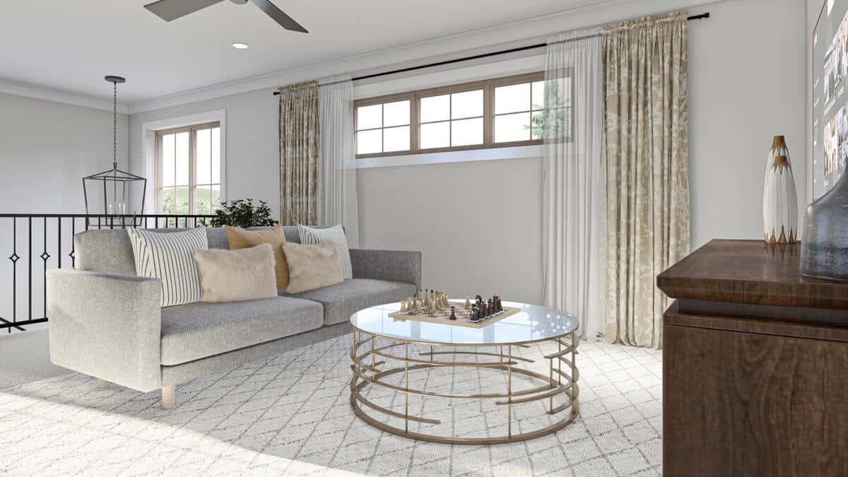 The expansive landing accommodates a cozy sitting area.