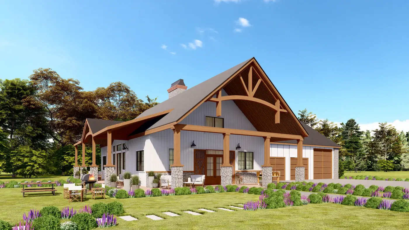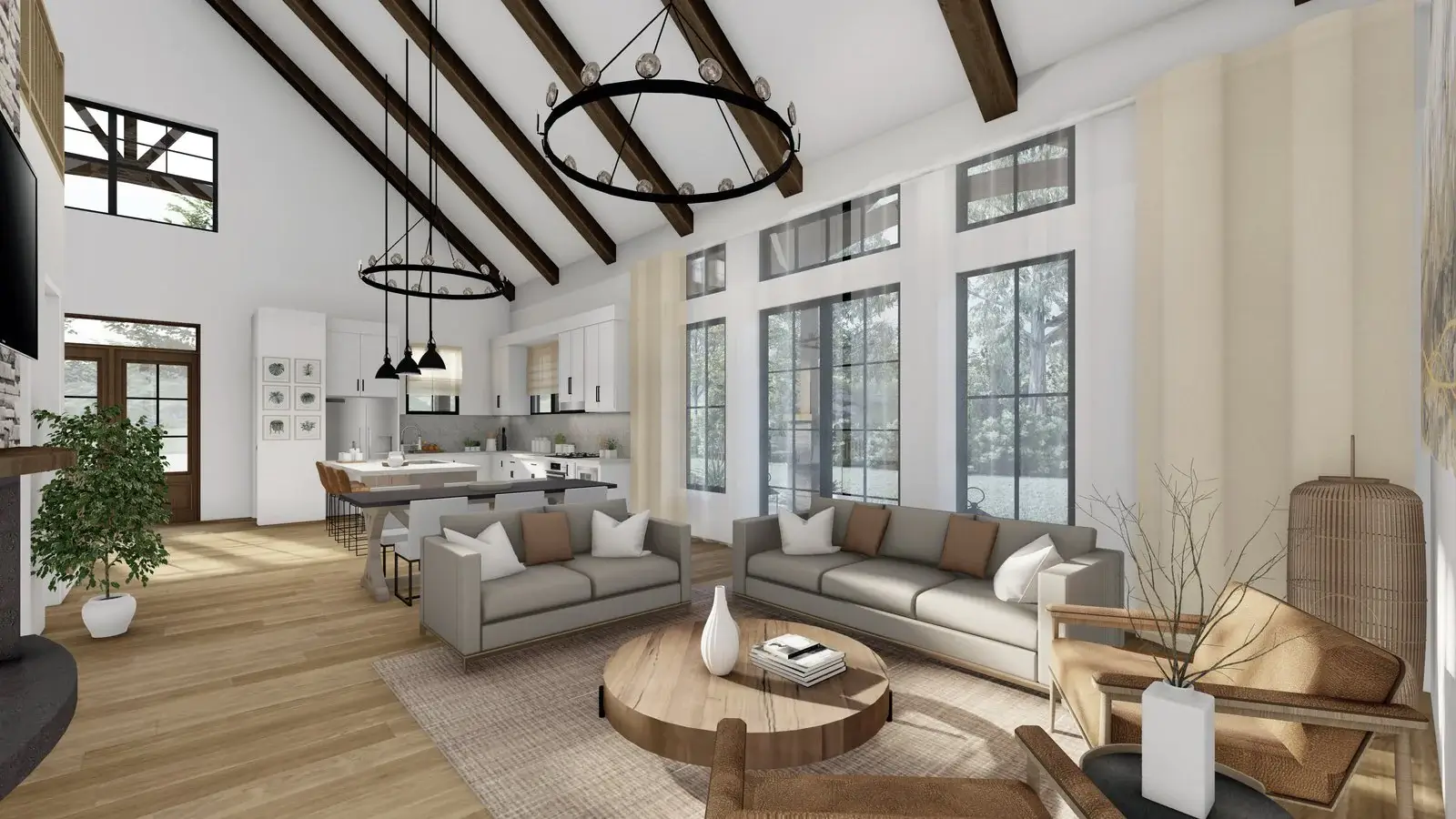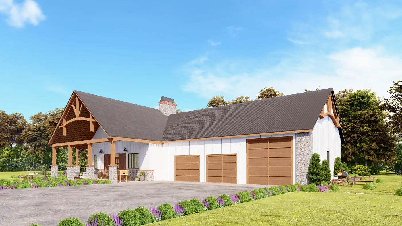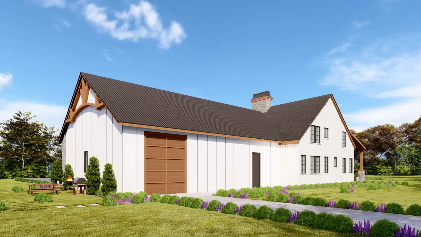 Introducing a contemporary barndominium design that embraces an open-concept layout and boasts soaring vaulted ceilings.