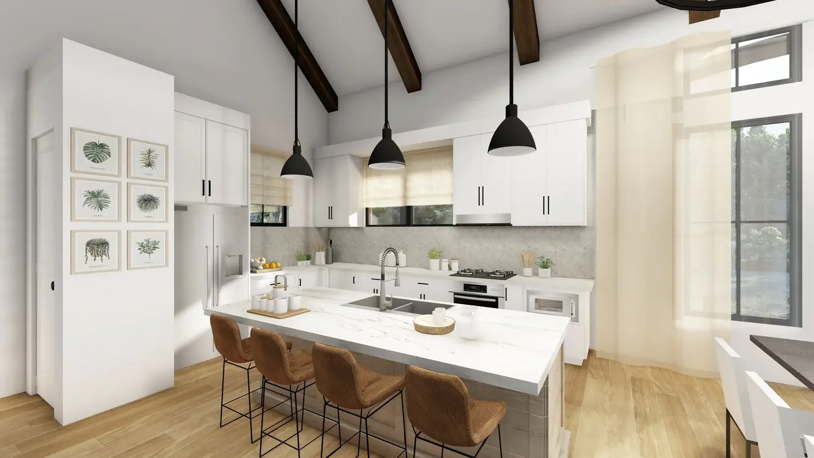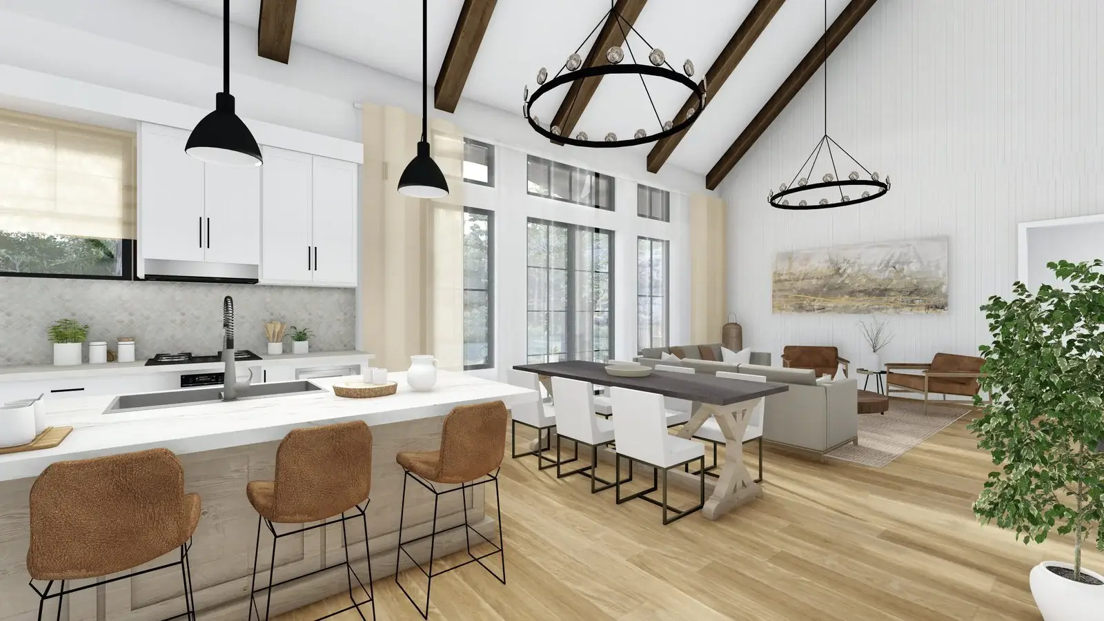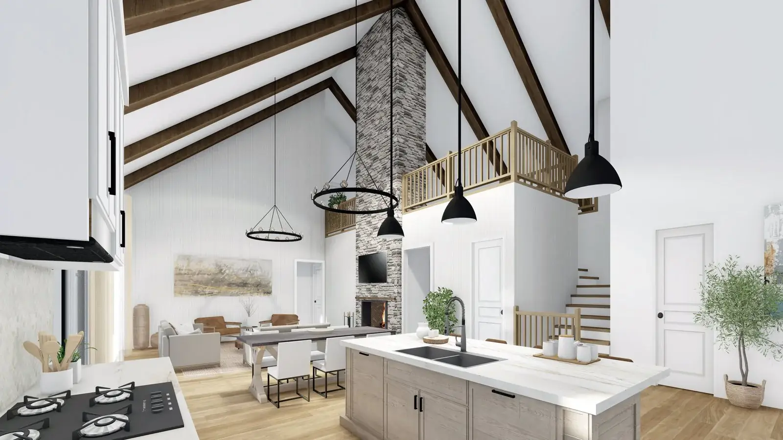 Introducing a contemporary barndominium design that embraces an open-concept layout and boasts soaring vaulted ceilings.