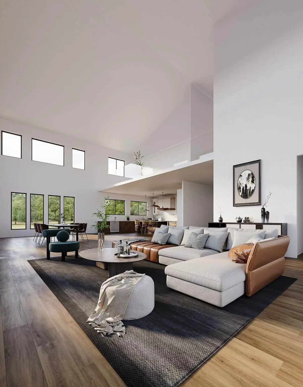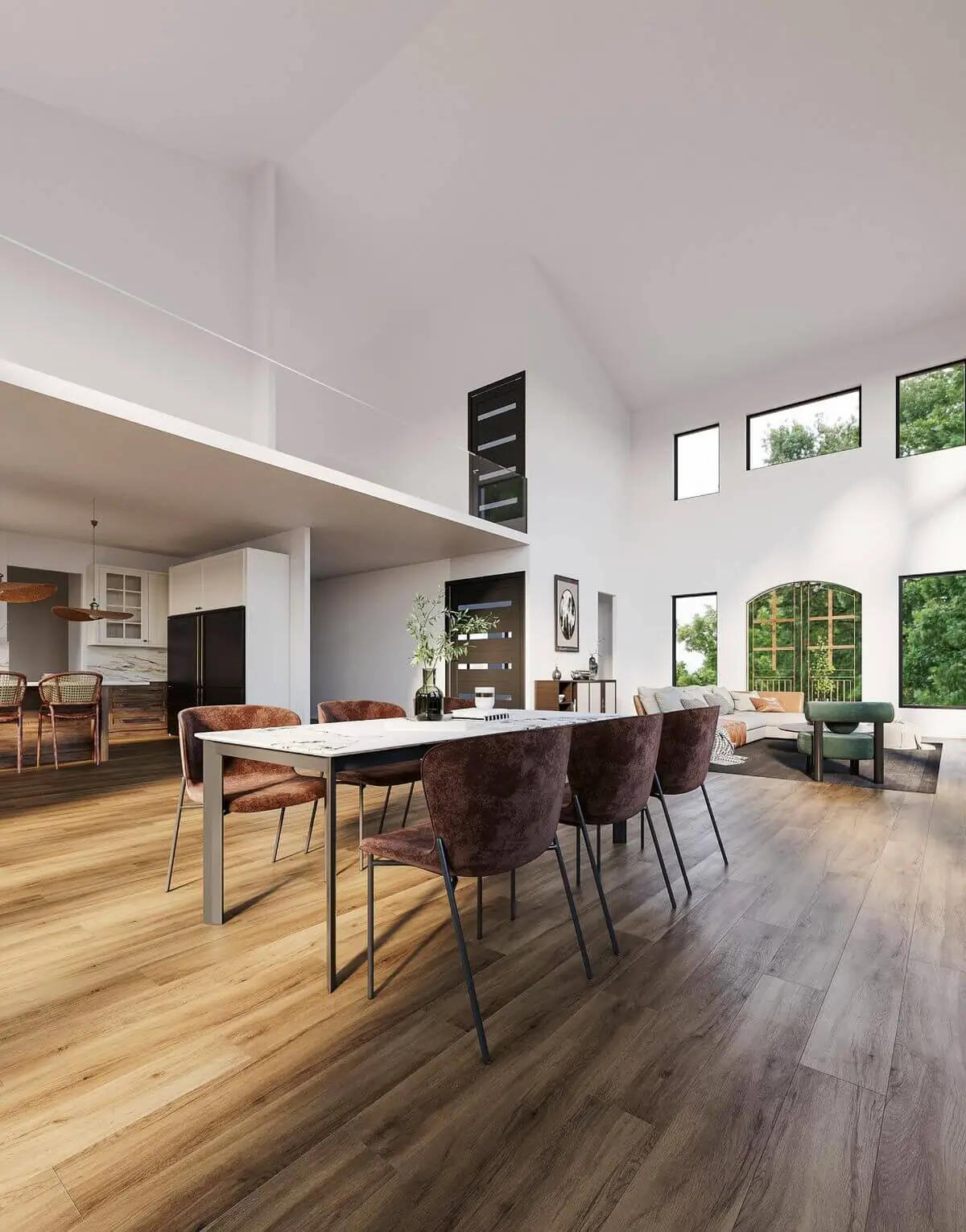 Inside, the great room and dining area feature soaring two-story ceilings, creating a spacious interior ideal for hosting gatherings with friends and family.