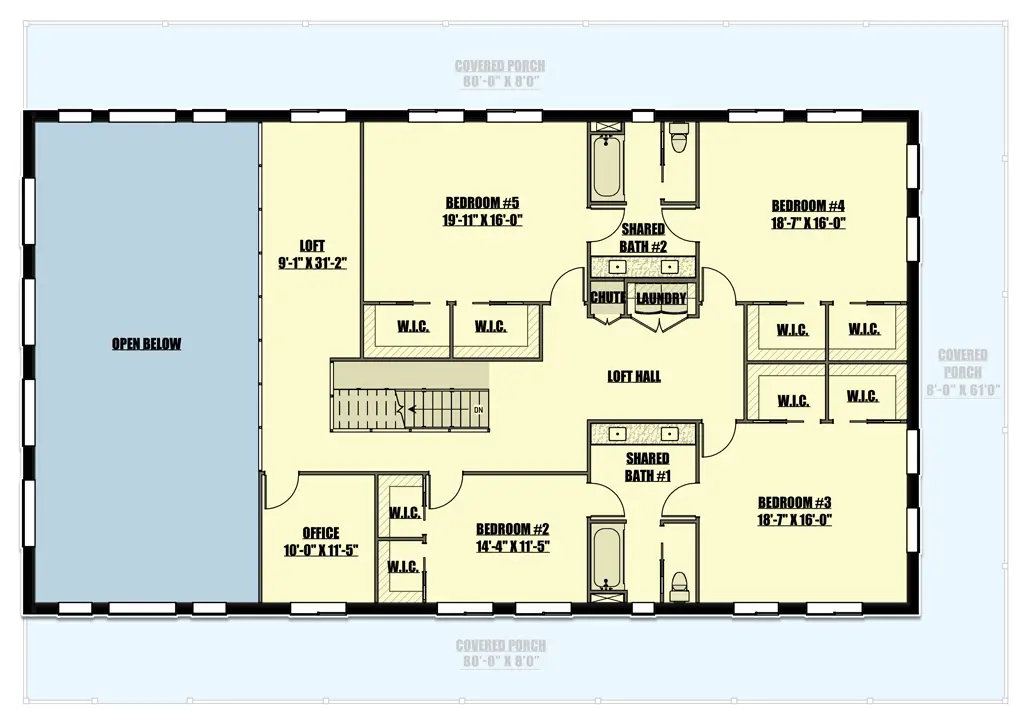 Welcome to the gallery of photos for a double-story, six-bedroom Barndominium Home with Wraparound Porch. The floor plans are shown below: