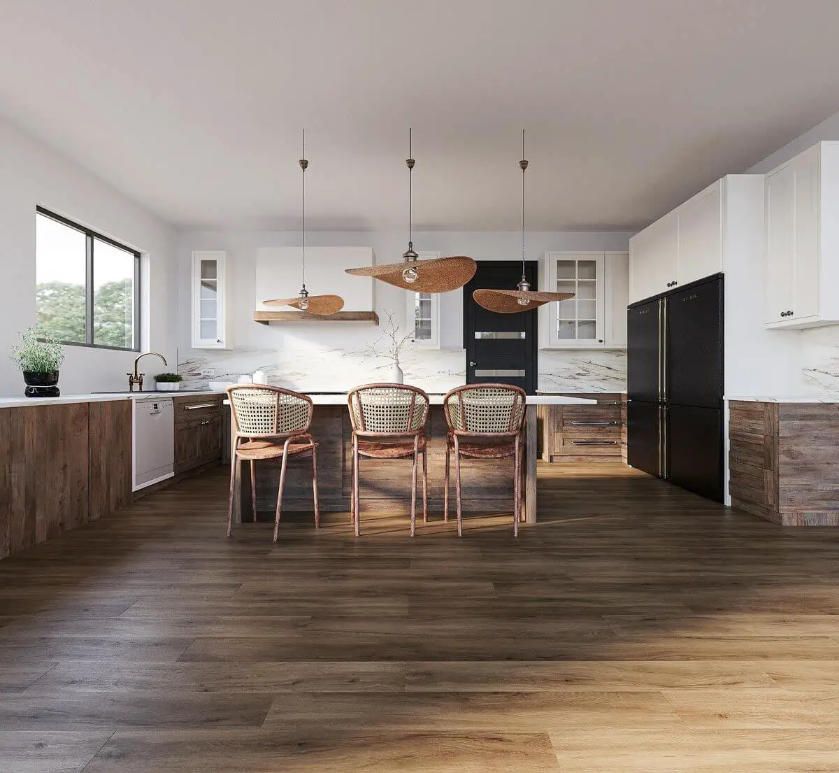 The kitchen features a central island accompanied by a chair and three elegant drop-down lights. The cabinets, made of both wooden and white materials, add a touch of sophistication to the space.