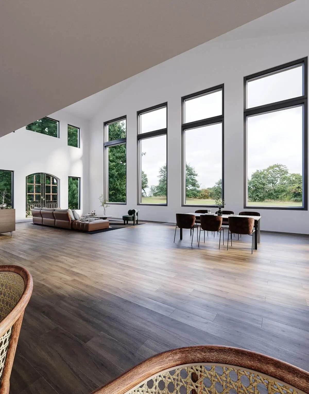 The dining area and living room offer a breathtaking panorama through their expansive windows.