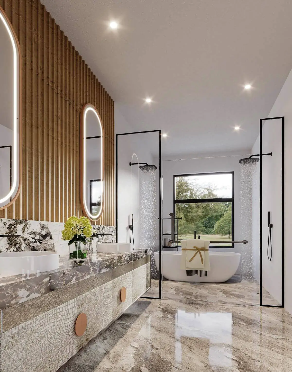 There are two spacious walk-in showers and a bathtub.