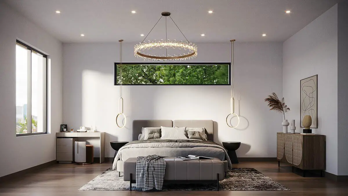 The master bedroom features a captivating chandelier suspended from above, casting a gentle glow on the room’s opulent surroundings.