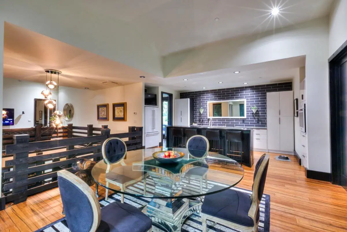 A round glass dining table with chairs that creates a stylish and inviting setting. From this spot, one can enjoy a captivating view of the adjacent kitchen.