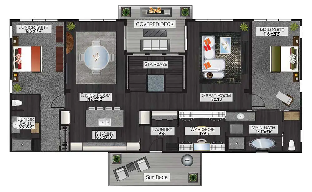 Ensuring privacy for both occupants, the master suite and junior suite are thoughtfully positioned on opposite sides of the home. This layout allows for a peaceful retreat and personal space for everyone in the house.