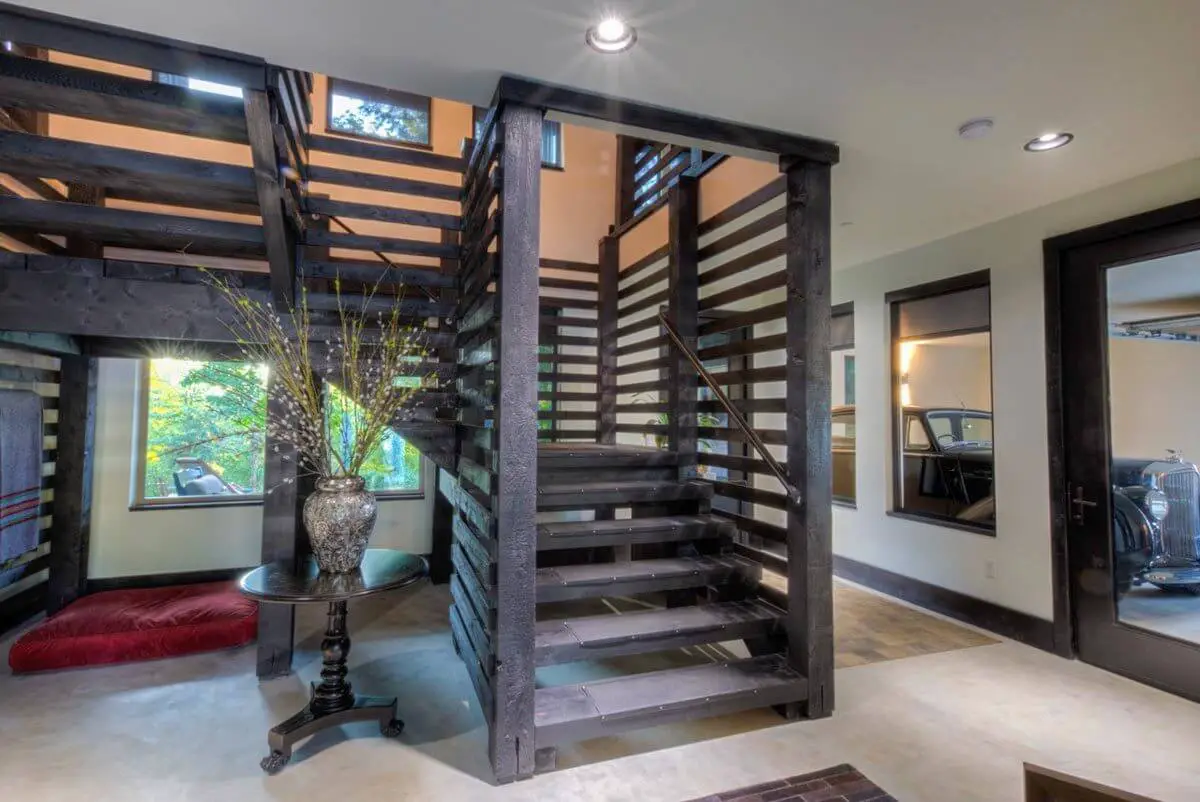 The foyer’s wooden staircase leads to the second floor.