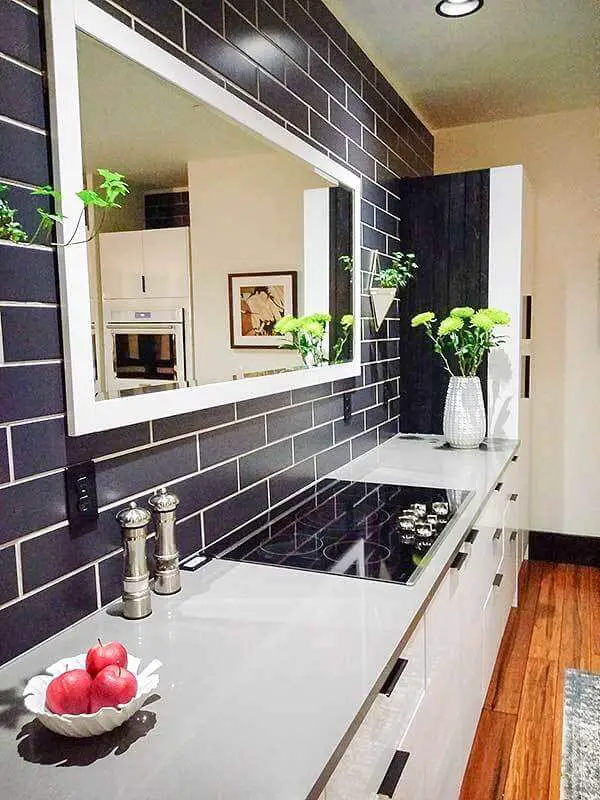 The kitchen is equipped with modern appliances and with a spacious mirror.