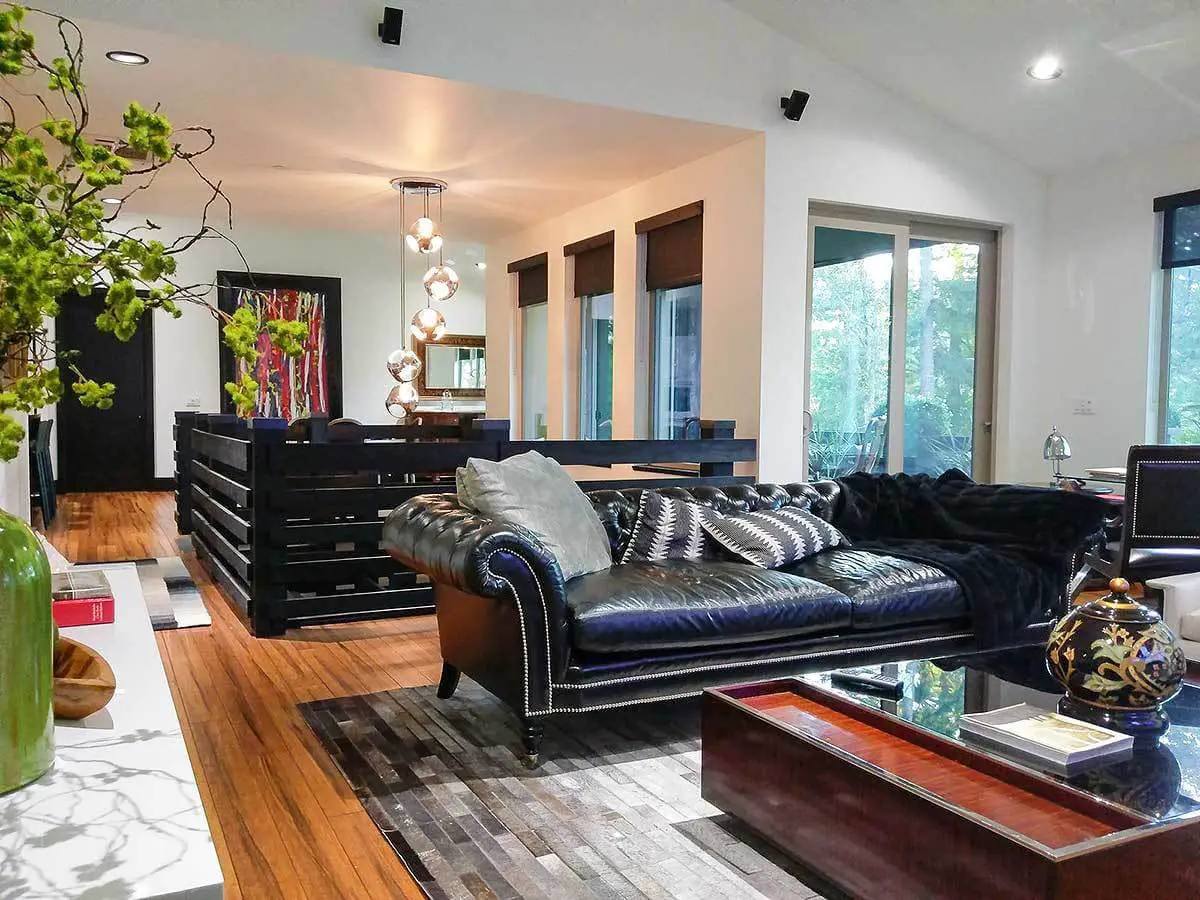 In the loft, there is a coffee table accompanied by a sleek black leather sofa.