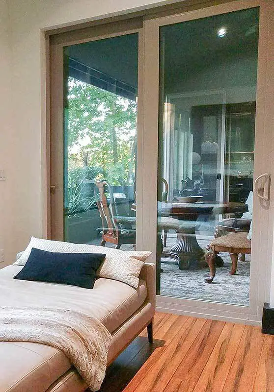 The bedroom boasts a beautiful wooden floor and expansive windows, inviting ample natural light and offering a charming atmosphere.