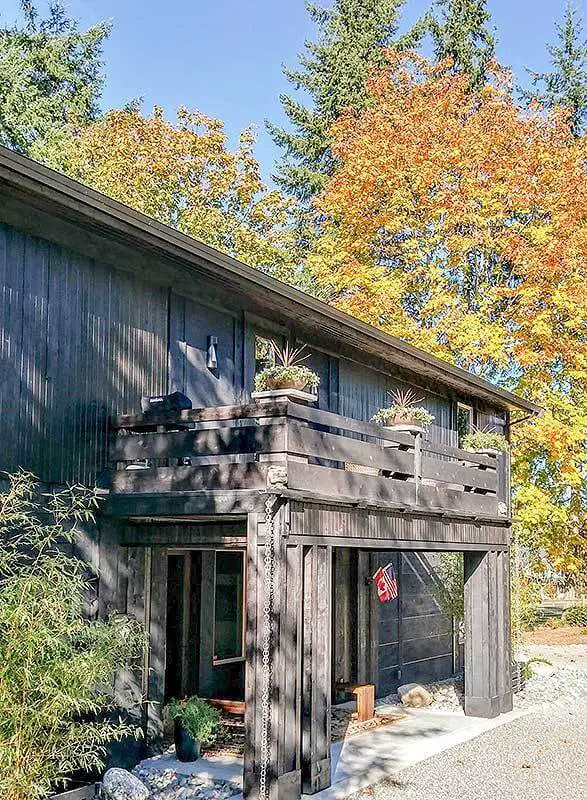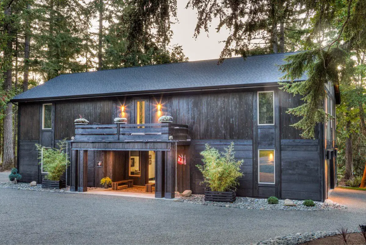 From the exterior, the Modern Barndominium House offers a striking view, highlighted by a sleek black wooden side wall and a convenient garage.