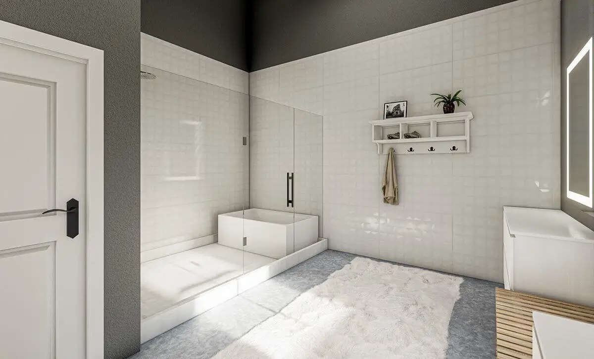 A bathroom featuring a white tiled wall, complete with a vanity and a separate shower room.