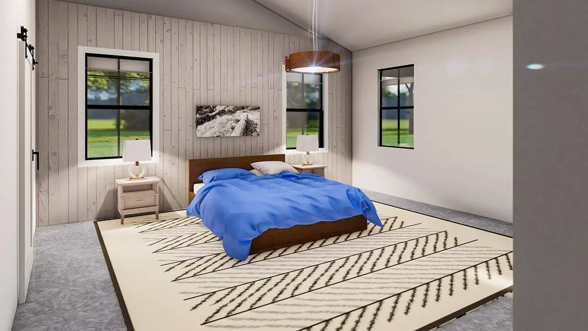 This exclusive one-story Barndominium house plan boasts expansive front and rear porches, measuring 7’11” deep and 9’11” deep, which span the entire width of the living space.