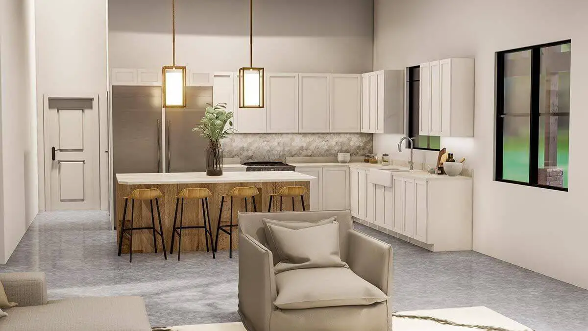 A kitchen center island featuring a chair and two elegant drop-down lights, accompanied by white cabinets.