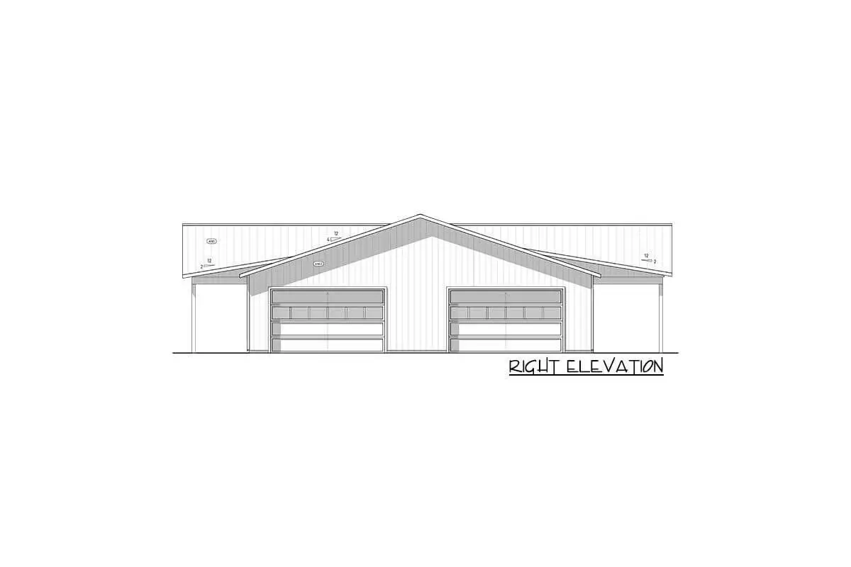 On the right side of the design, the garage and workshop area dominate, offering convenient entry through overhead doors from the side.